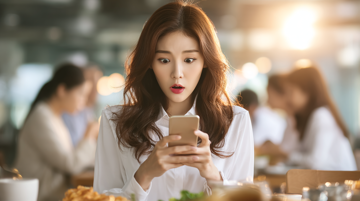 [이미지 삽입]: Korean office worker at company cafeteria during lunch break, shocked expression while reading economic news on smartphone, late summer warm lighting through windows, surprised colleagues eating in background, realistic photography style, no Korean text