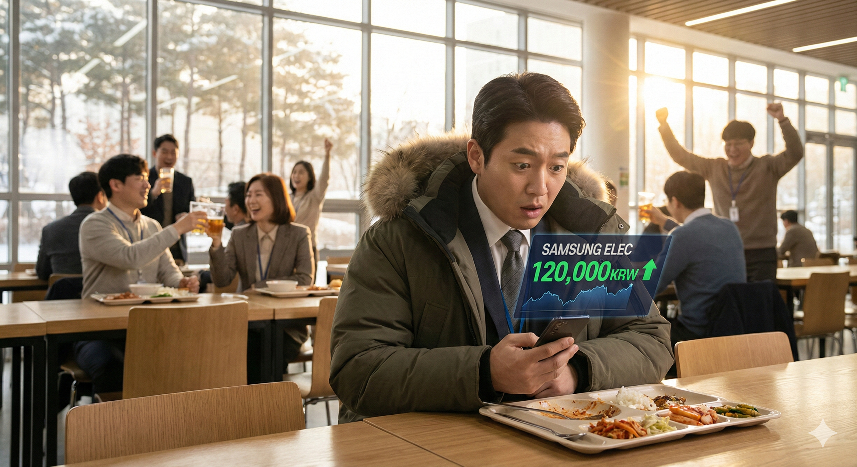 점심시간 카페테리아에서 삼성전자 12만원 돌파 소식에 놀라는 직장인의 모습