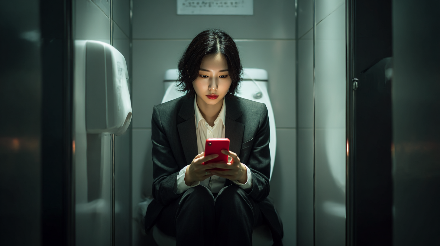 회사 화장실, 김씨는 볼일을 보면서도 스마트폰을 놓지 못했다.