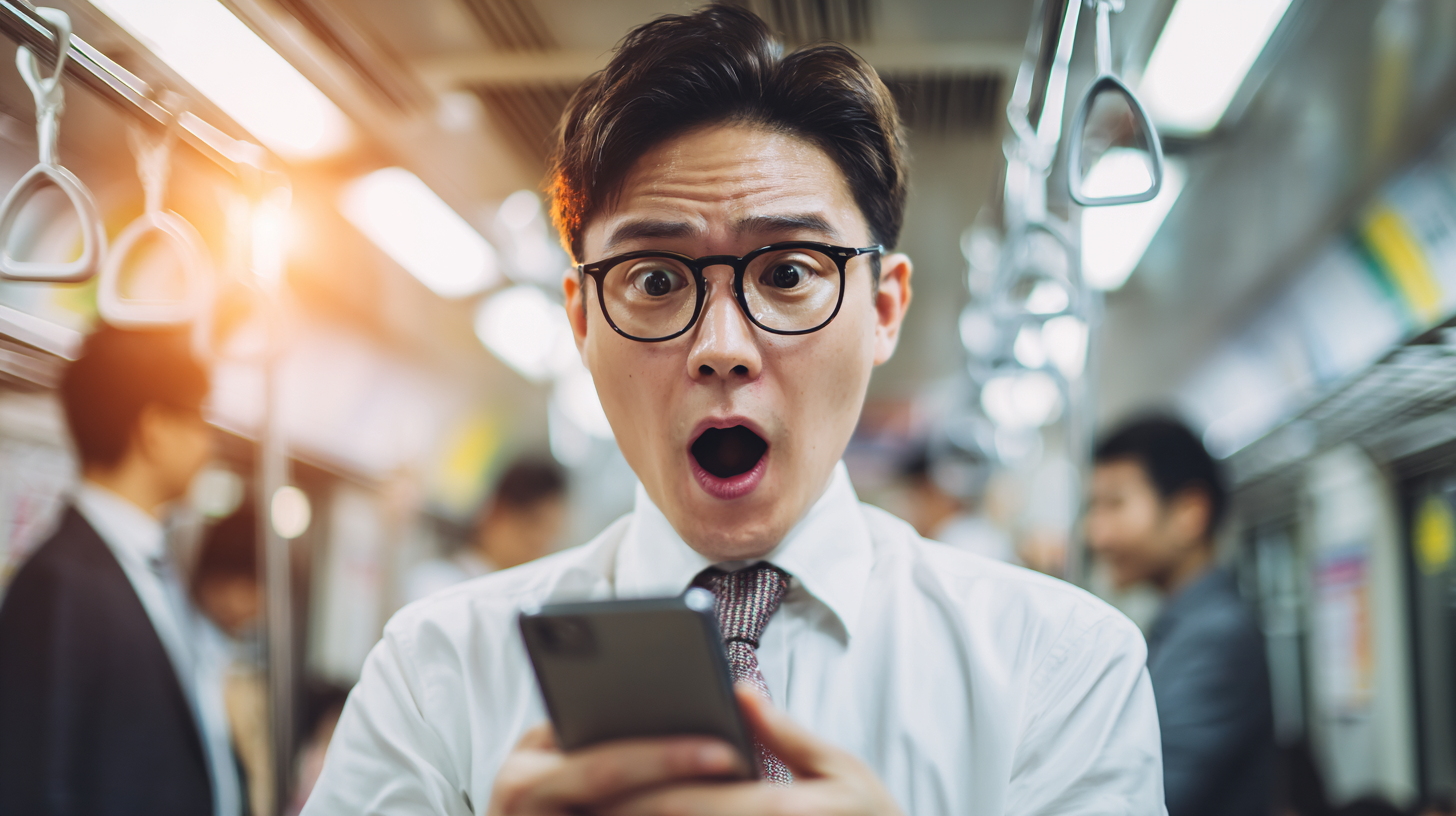 shocked and excited expression while checking stock app on smartphone showing KOSPI 3549,