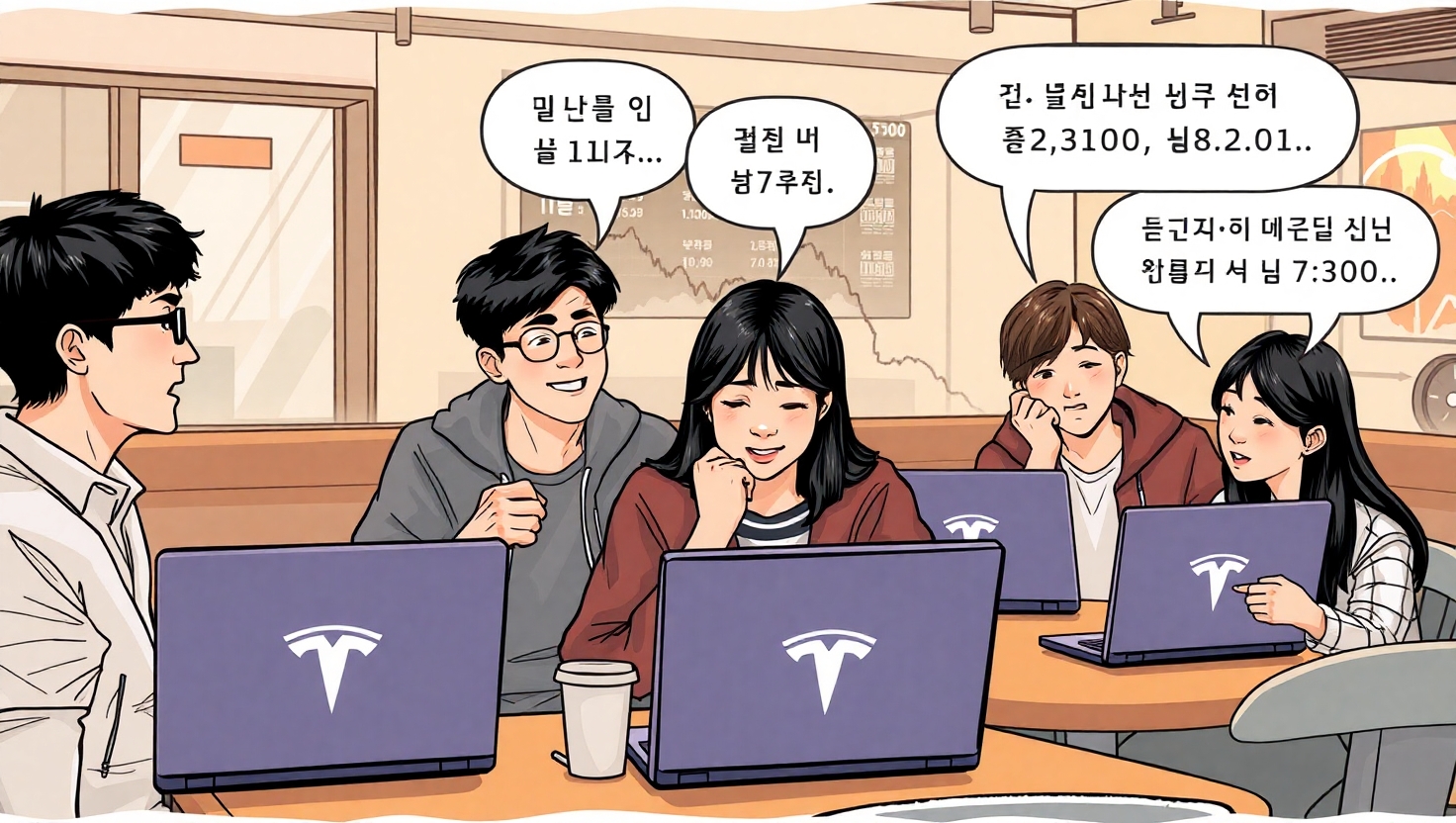 테슬라 관련 뉴스가 연달아 터지면서 주말 카페에서도 테슬라 토론이 뜨겁다는 패러디가 나왔어요.